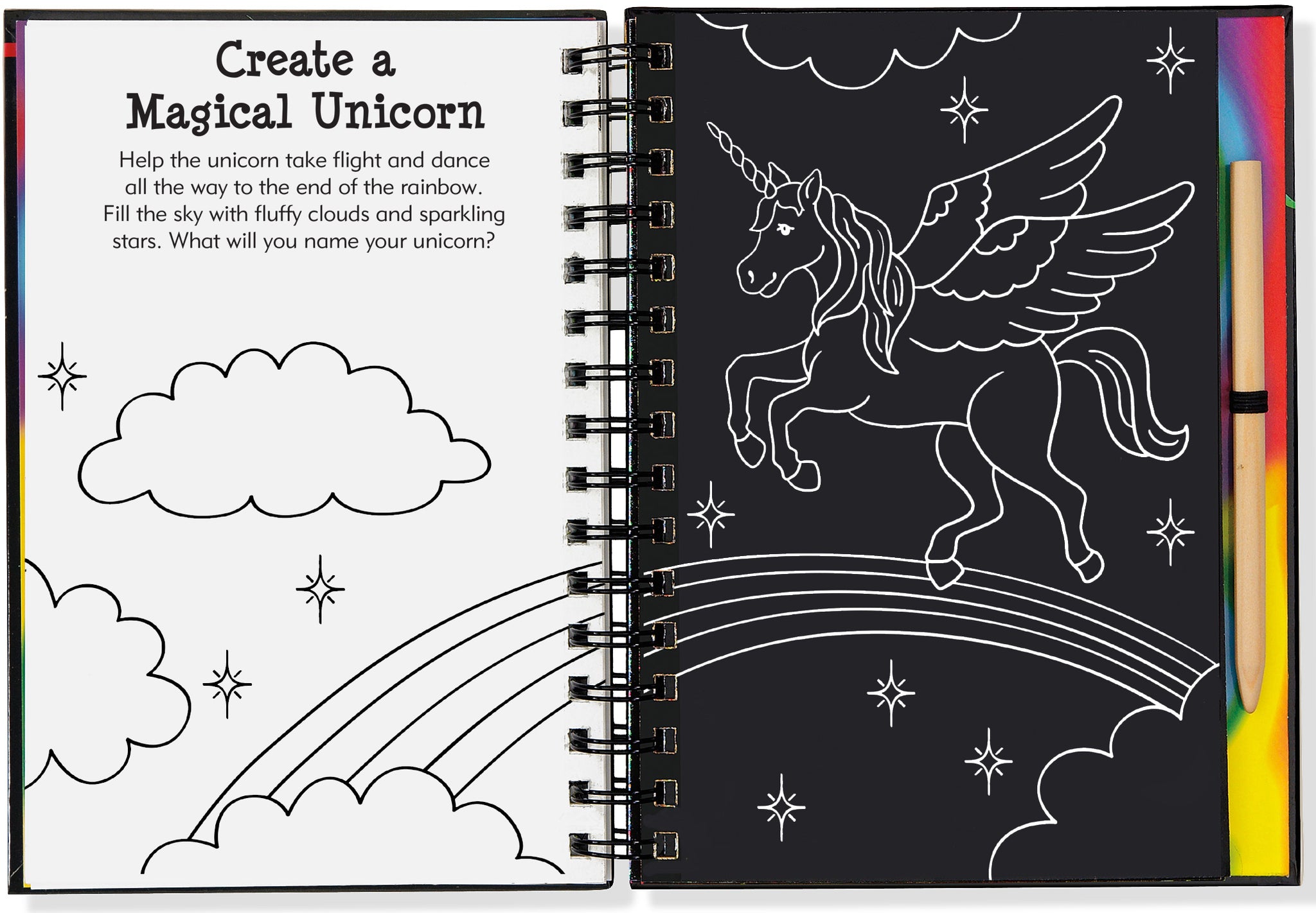 This is a Trace-Along title! White outlines on black scratch-off pages create a fun way for younger children to trace illustrations. Shrink-wrapped with a wooden stylus for drawing on black-coated paper to reveal colors beneath. 64 pages. Includes 20 scratch-off, 20 illustrated, 20 sketch pages. 6-3/8'' wide x 8-1/2'' high; wire-o bound hardcover.