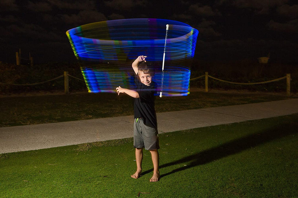 Create a magical illusion with WANDINI - an awe-inspiring, levitating LED wand! Whirl, swirl, and twirl - anyone can perform dazzling and mesmerizing light shows at night with Wandini. Simply loop Wandini around your middle finger to create an illusion of bright lights floating luminously in the air with your hands. Everyone will wonder, is that magic? Changes colors - 8 light modes, invisible string & leather strap with middle finger loop, USB rechargeable - no batteries needed, collapsible for quick assembly/disassembly, precisely weighted for vertical balance, portable & travel friendly. Assembles to 24” length