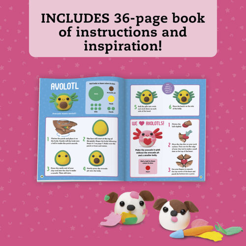Make the cutest clay animals with just a few simple steps. No sculpting experience required! First, learn how to make simple shapes with 10 colors of clay, like balls, triangles, and snakes. Then put them together to create your new animal friend. Customize your creation with cute hats and other fun accessories. This kit includes everything you need to make up to 15 adorable animals, including a boba bear, unicorn kitty, strawberry milk cow, and avocado axolotl, a.k.a. Avolotl.