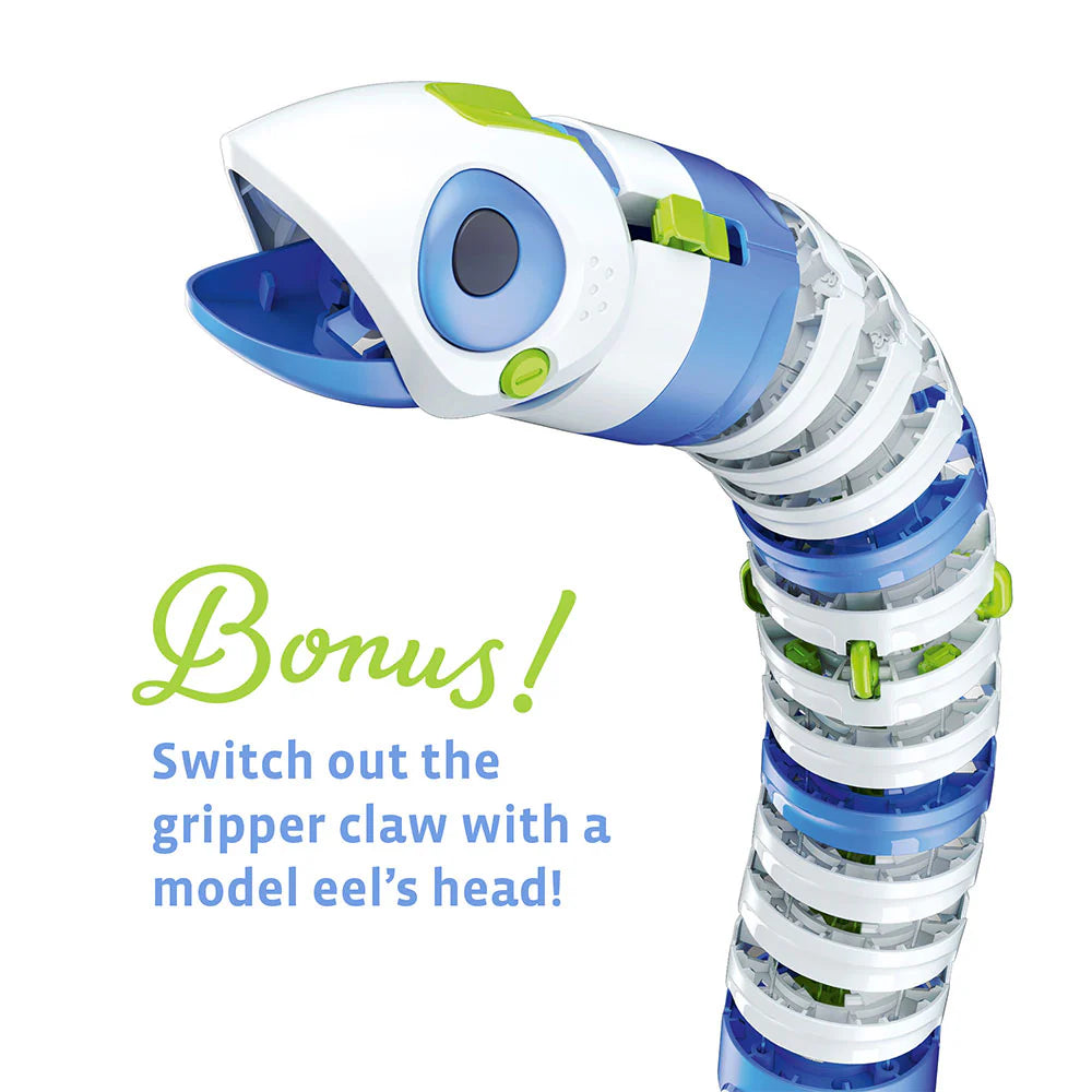 Bonus: Switch out the gripper claw with a model of an eel’s head to transform your robotic arm into a slithery bionic eel. Can you pick up the included small shrimp models with the eels mouth?