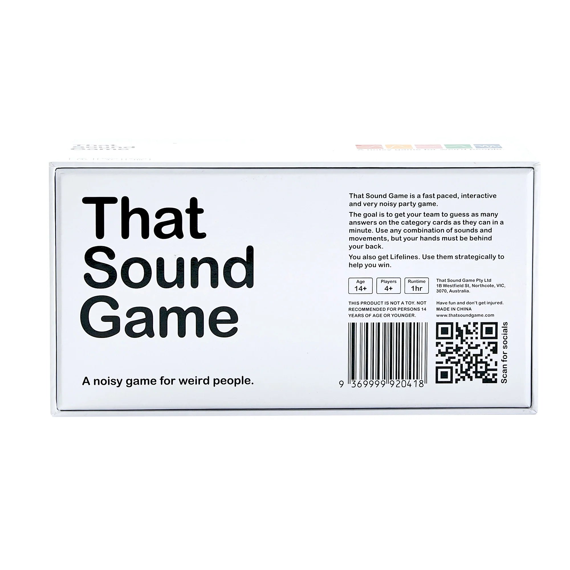 That Sound Game is a fast paced, interactive and very noisy party game. The goal is to get your team to guess as many answers on the category cards as they can in a minute. Use any combination of sounds and movements, but your hands must be behind your back. You also get Lifelines. Use them strategically to help you win.
